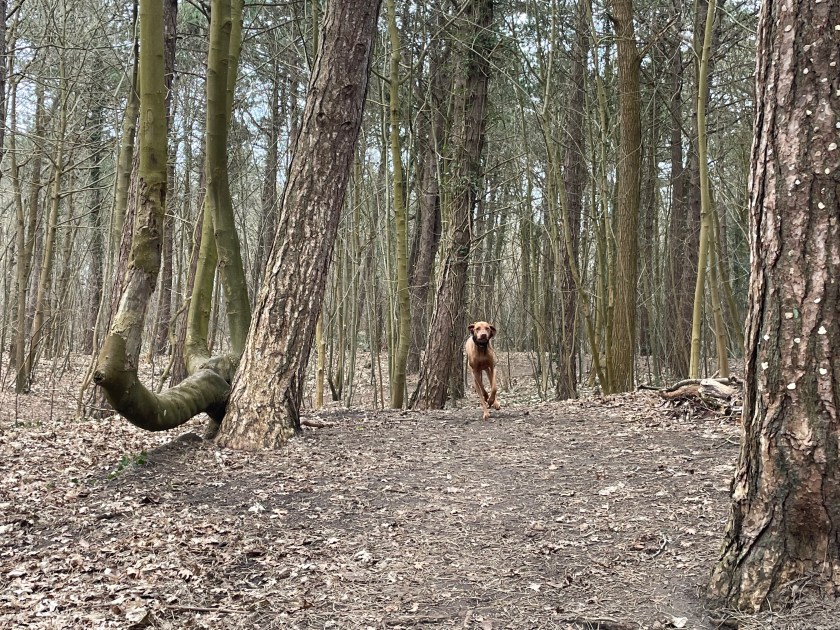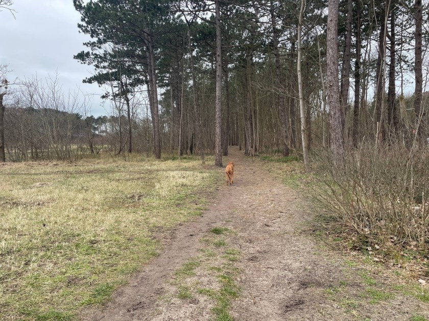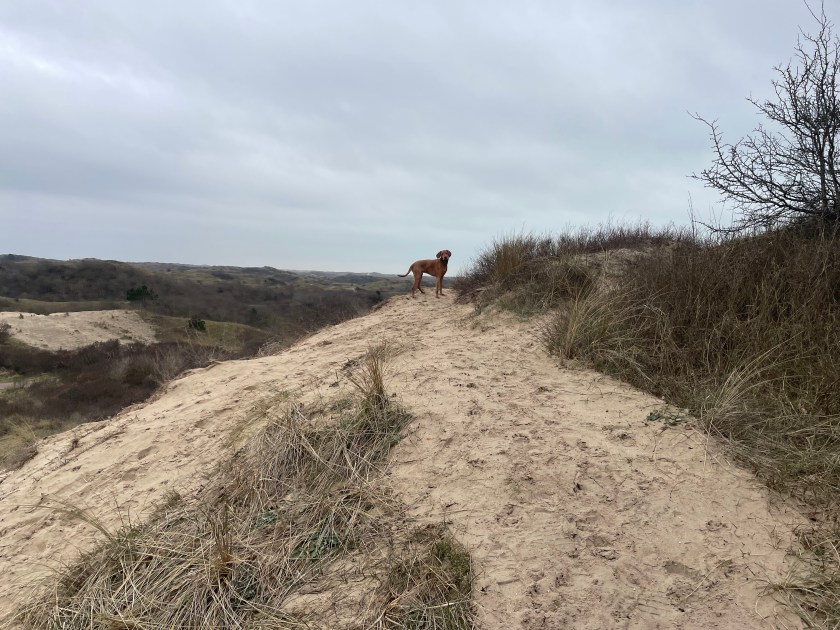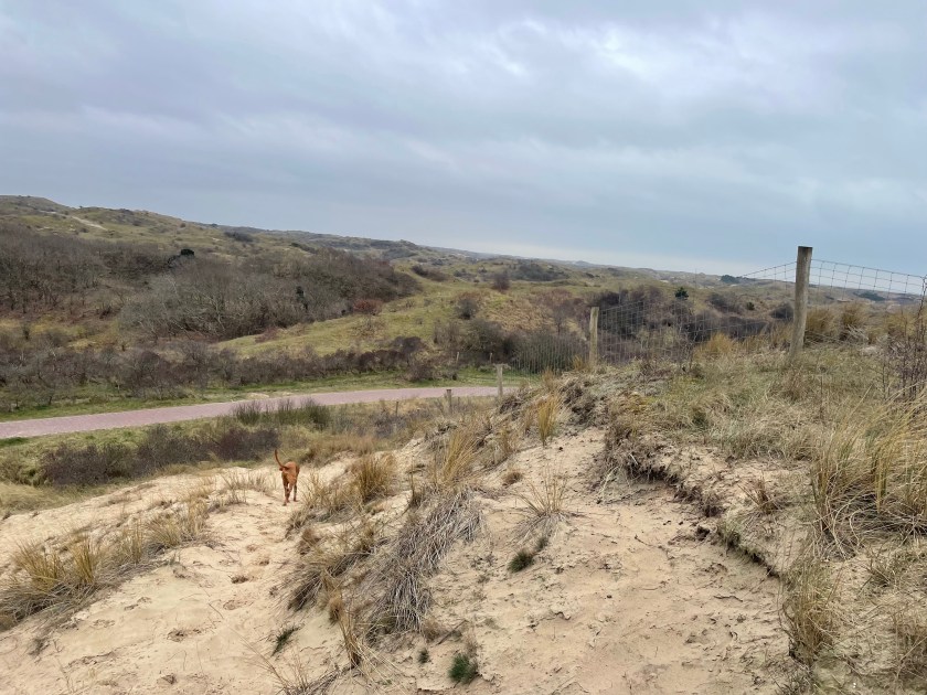 The landscape here is a lovely mix of a large open field, uncharacteristically hilly pathways through the trees and a bit of dunescape. It may not be huge in square metres but the pathways slalom around the trees which means you can make the walk longer than simply walking around the perimeter. At one point the walking area ends with a clearly placed wire fence, and that will lead you down to the Bloedweg bike path, but you only need to walk along it for a few minutes until you find a way back into the forest area. Of course you can simply turn back the way you came if you want to avoid the bike path completely.